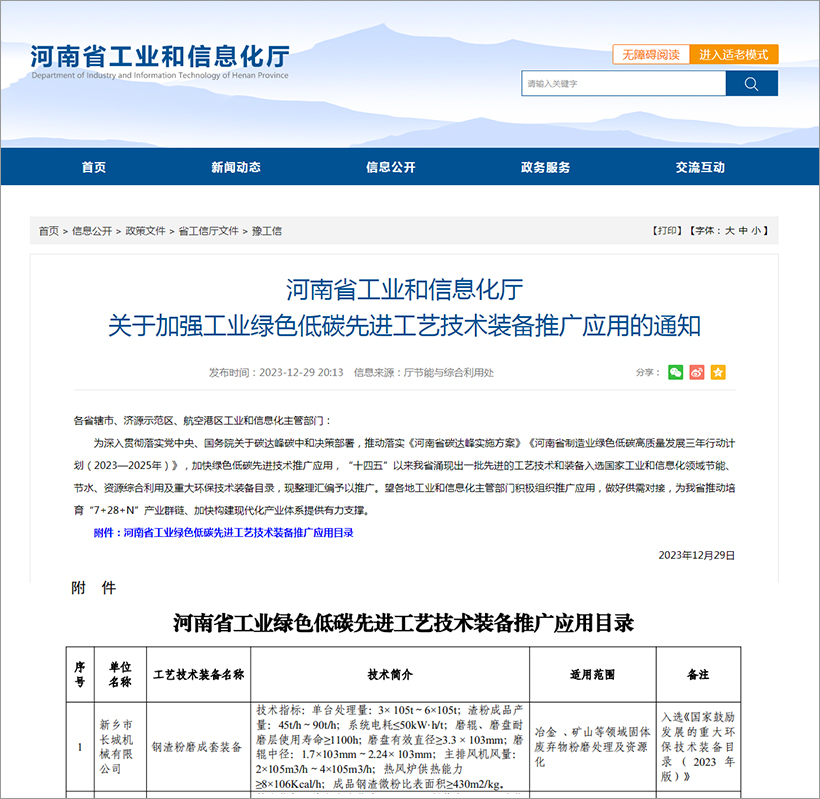 新鄉(xiāng)長(zhǎng)城的“鋼渣粉磨成套裝備”入選工業(yè)和信息化部與生態(tài)環(huán)境部聯(lián)合編制的